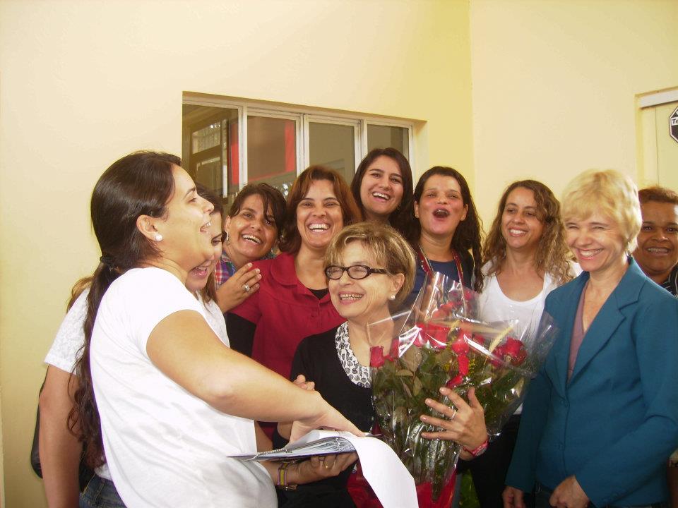 Maria Teresa Mantoan recebe homenagem das professoras de Betim (MG): Rosimeire Câmara de Almeida está à direira, de azul
