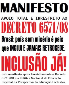 MUITO MAIS do que três entidades filantrópicas que caminham na contramão da inclusão e dos direitos humanos, O MANIFESTO DE APOIO À POLÍTICA NACIONAL DE EDUCAÇÃO ESPECIAL NA PERSPECTIVA DA EDUCAÇÃO INCLUSIVA, embasada na CONVENÇÃO SOBRE OS DIREITOS DAS PESSOAS COM DEFICIÊNCIA, é TAMBÉM UM MANIFESTO DE APOIO AO DECRETO 6571/2008, que faz computar a matrícula do aluno público alvo da educação especial em dobro no âmbito do FUNDEB. Neste sentido, em nome dos mais de 12.000 signatários do referido Manifesto (ver abaixo), afirmamos que não aceitaremos a sua revogação.
